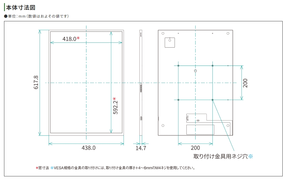 | 外形寸法 WxHxD (mm) (TYP.) | 438.0×617.8×14.7 (ディスプレイ部のみ)(突起物を除く) |